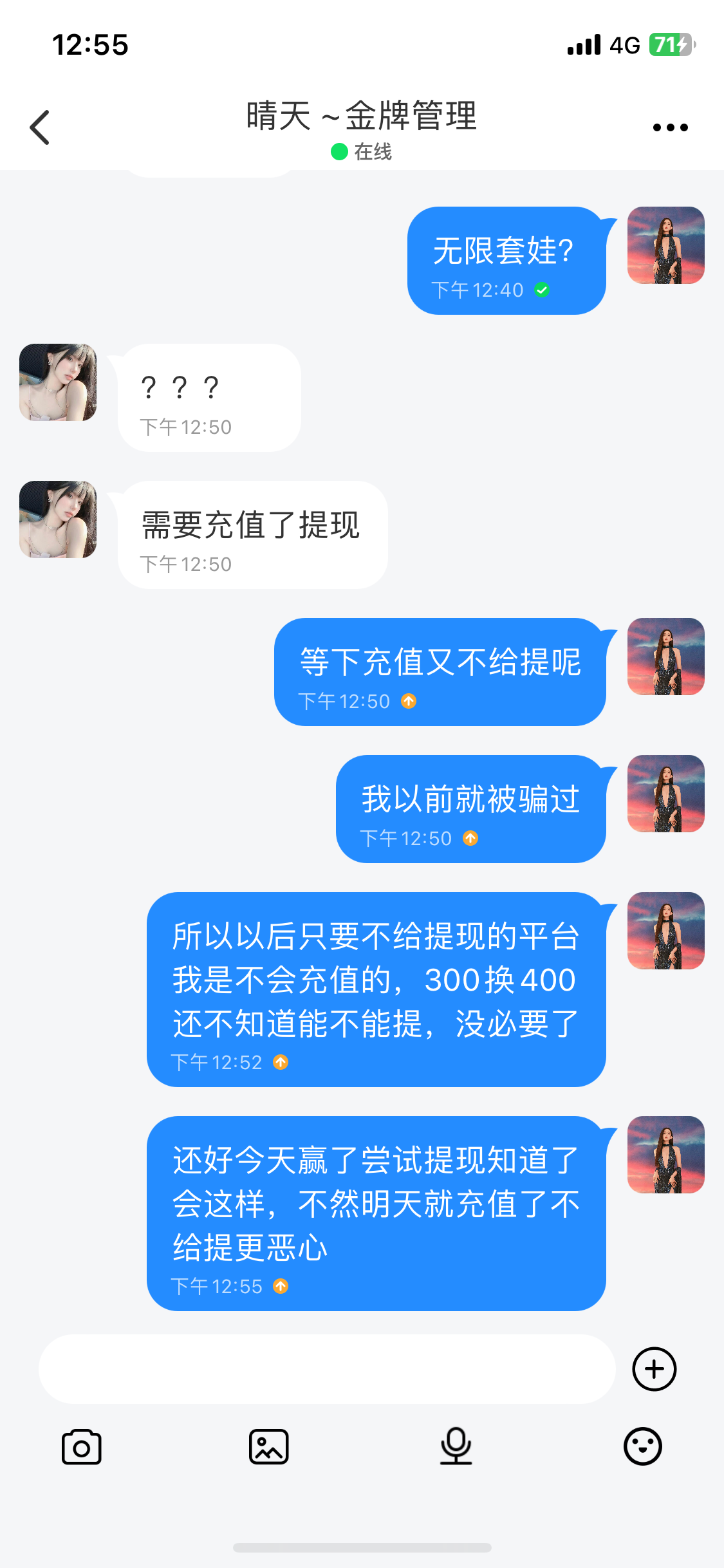 6天送500那个,前面4天不需要充值,第四天打出来了,不给买单双对压不给买数字,然后一直没有违规下注,好不容易打个400要充300,闹呢!还风控,就是玩不起,天天忽悠充值