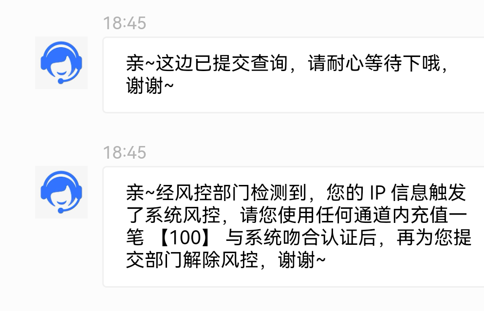 打到200说我ip问题 需要充值100三杯水可以充值嘛?