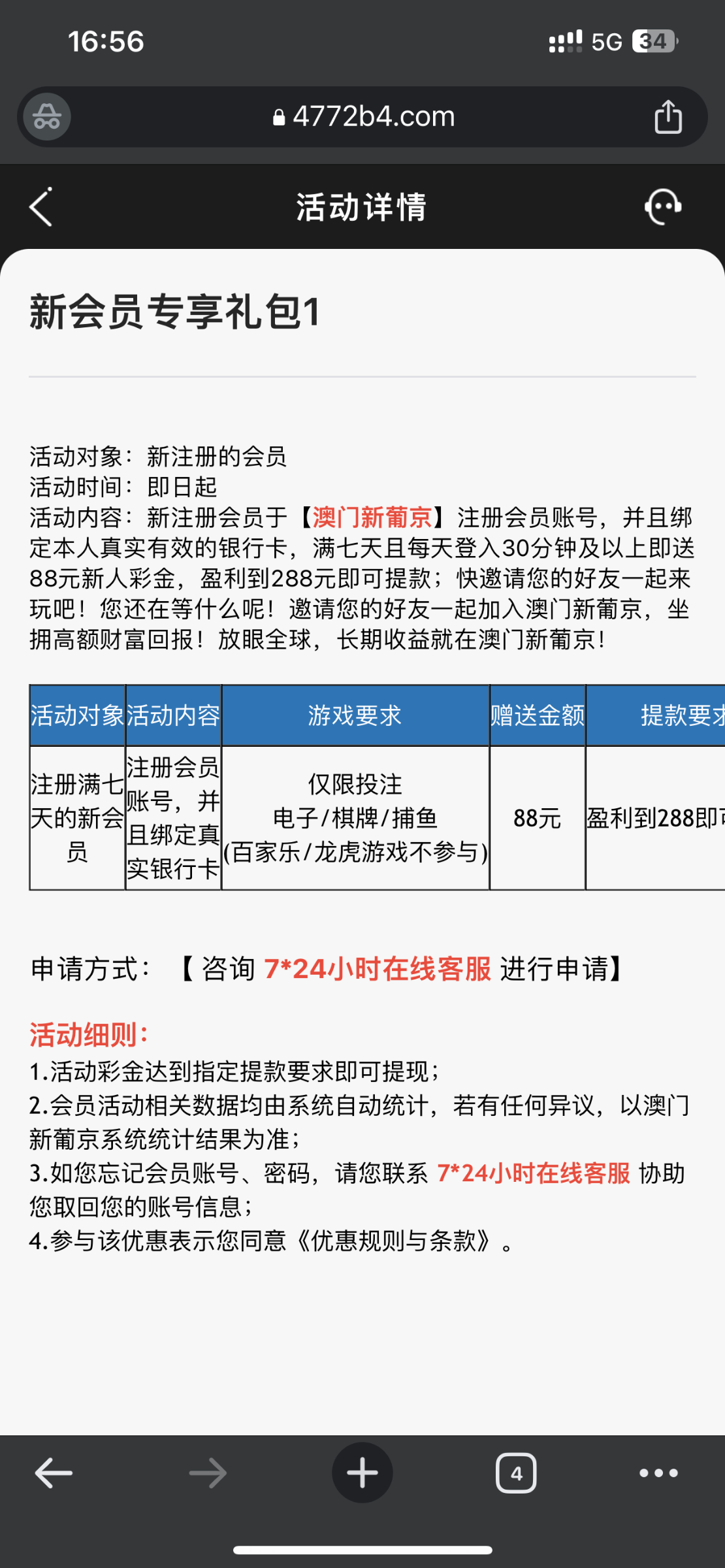 新用户注册绑卡每天登陆30分钟 连续七天以后联系在线客服申请88元彩金 建议自己保存每天去挂一下时长就可以了 游戏和提款限制自行查看优惠
