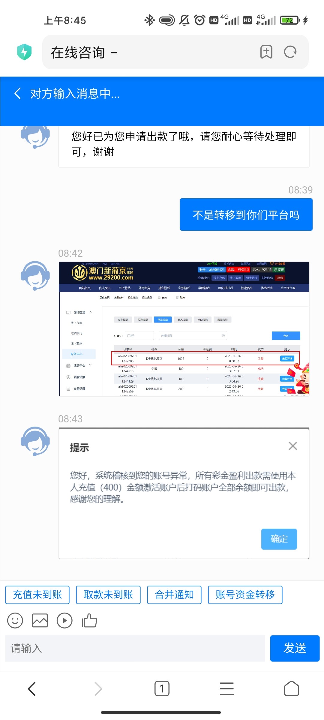 nancheng 卵用没有,还有一千多黑分,让他给我转移,他直接给我出款,能出款还用他?