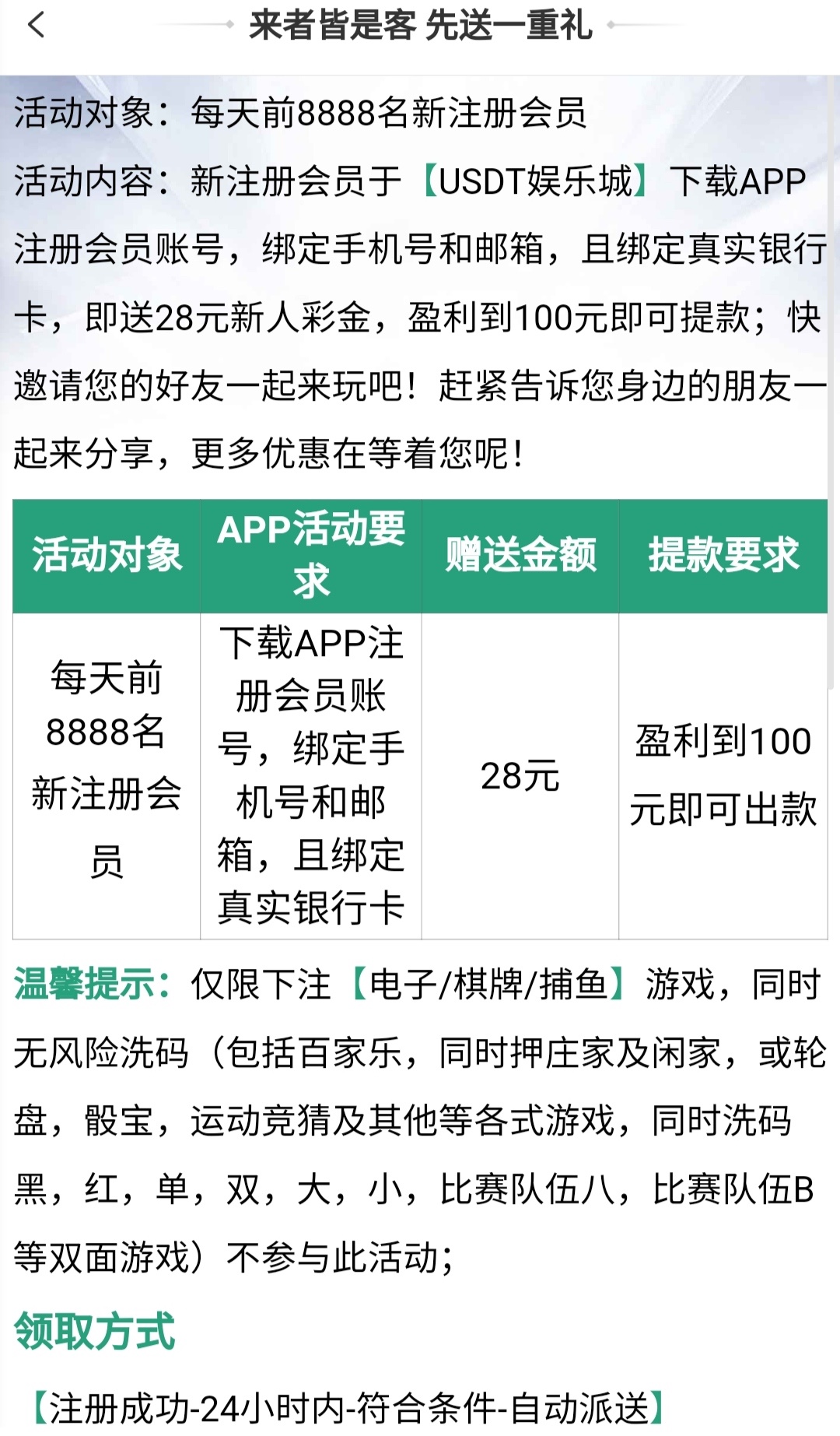 新用户注册下载完善资料二十四小时内送28,不送无视。限制电子/棋牌/捕鱼,最低100提。