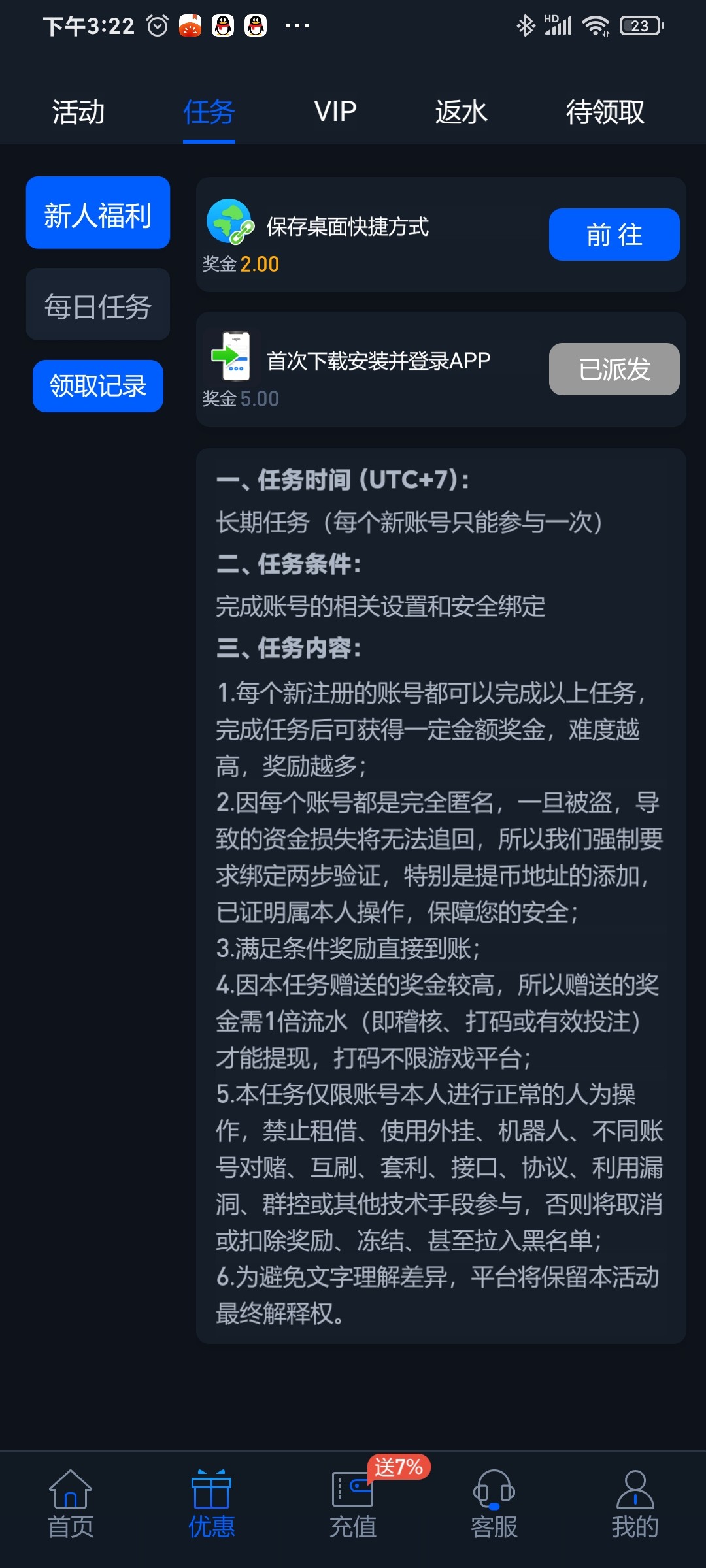 这台子虚拟币送百分之七也很给力  都是一杯流水  稳的平台活动基本都不会花里胡哨  现在虚拟币充值送的一共都快800了
