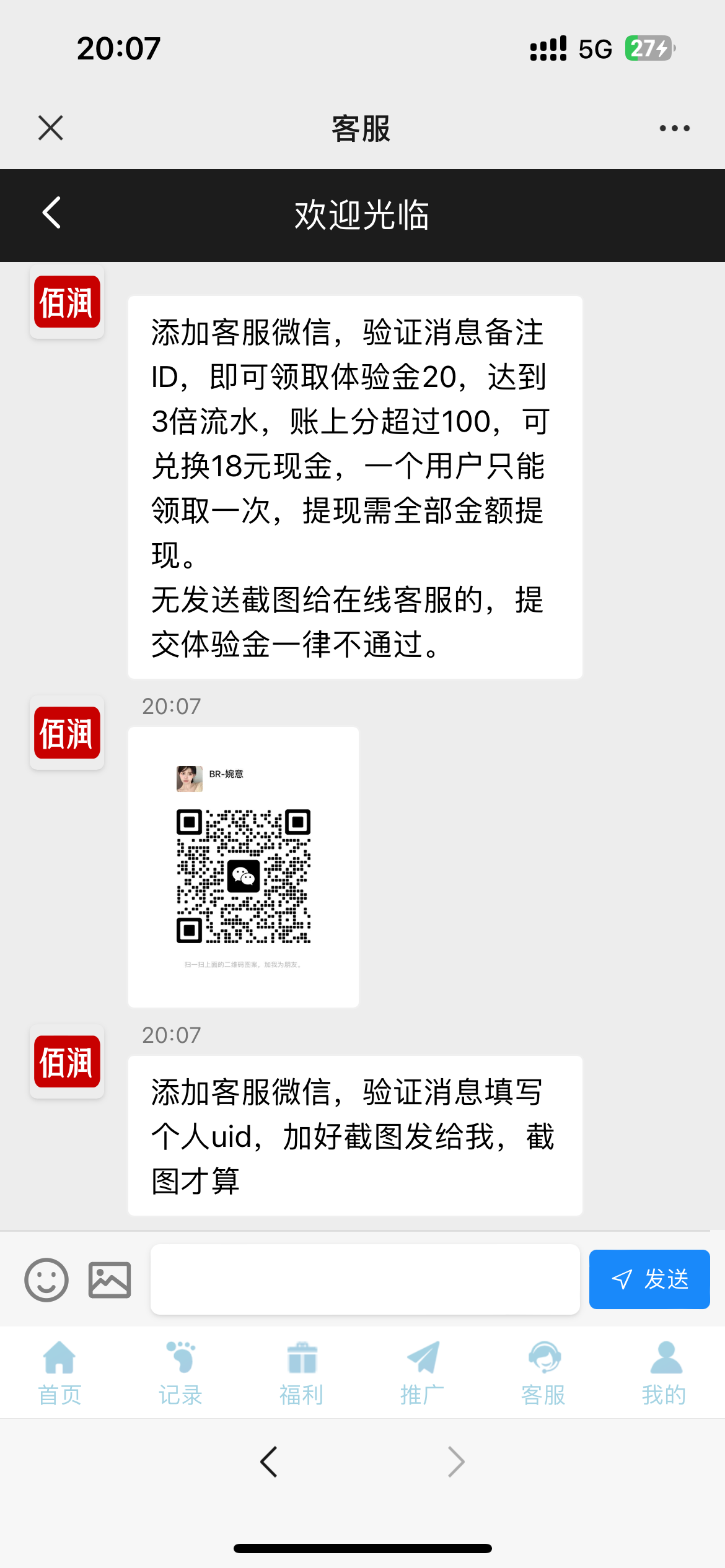 找在线客服加微信截图 然后充值的地方领取体验金
