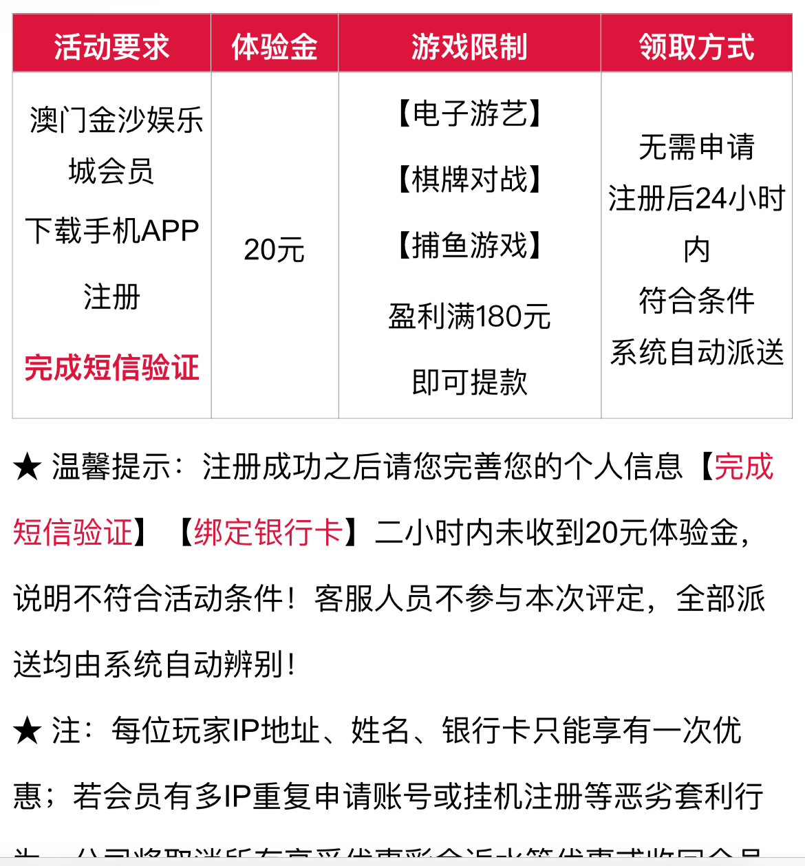 新用户注册绑定信息2小时派送20彩金,查IP具体看下图没送无视.