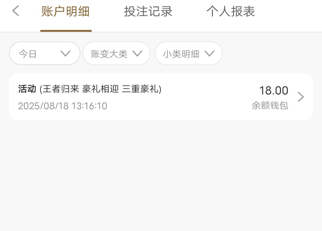 这个台以前出过以小博大的活动,很多老哥都充值过,看看自己的充值记录吧,符合要求的老哥,下载APP登录-活动区-王者归来-提交申请,无需流水即可钱包提款,建议直接提,忍不住的可以试试。