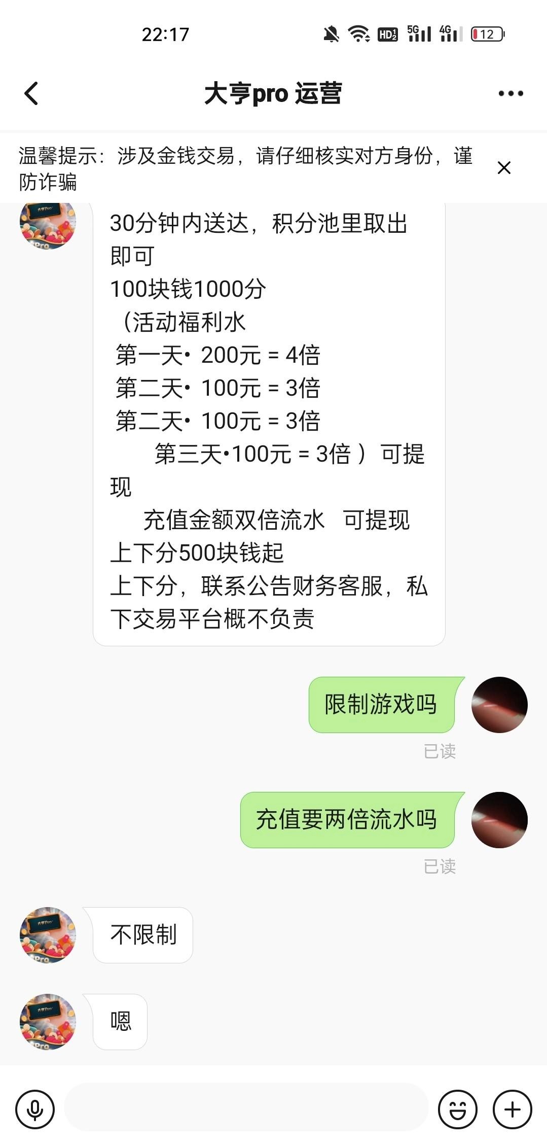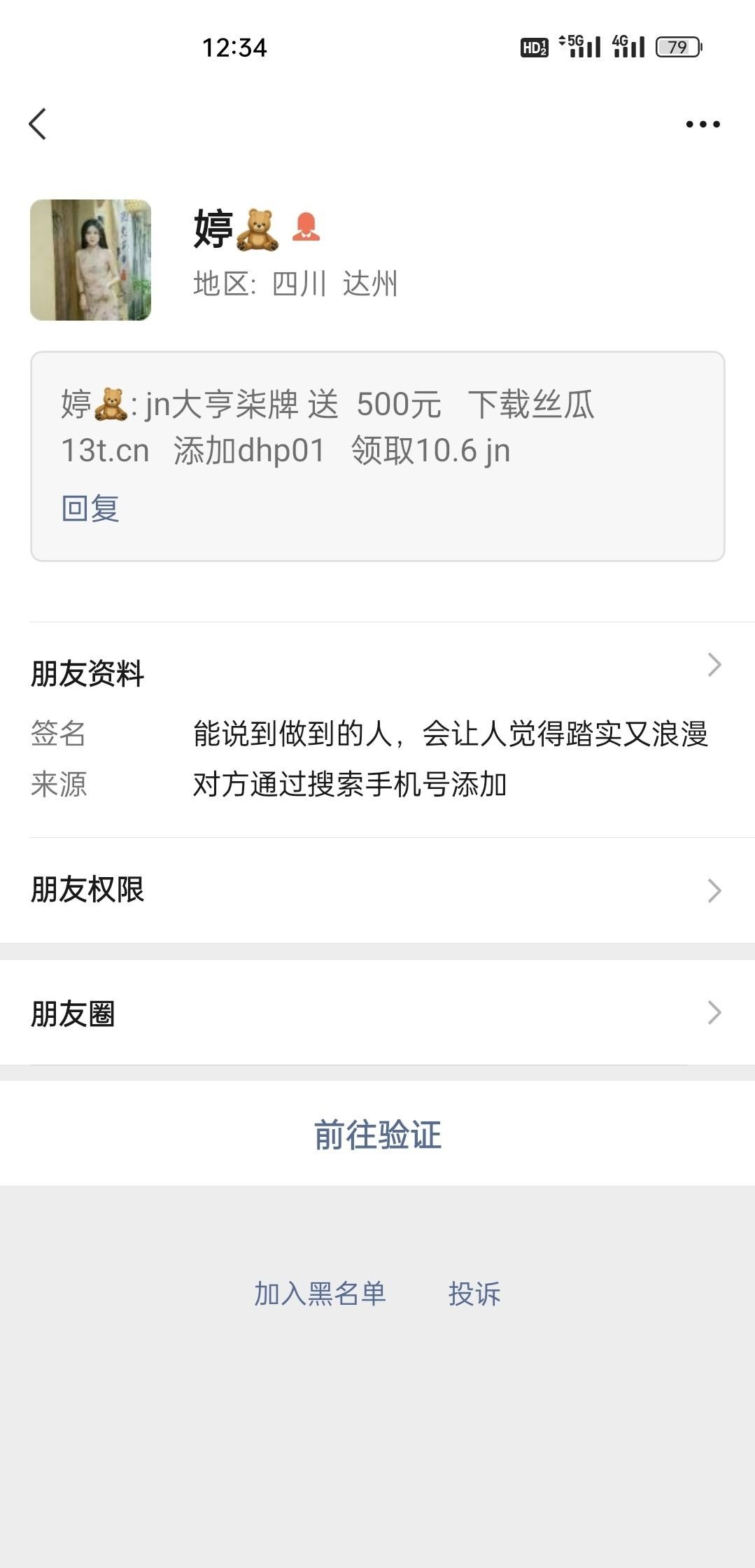 碰瓷500 微信收到好友添加验证看到的,宋五百 分四天送。出款自测 第一天宋的两百输完了流水没打完导致第二天赢了流水不够刷流水输完了。四天都没打出来