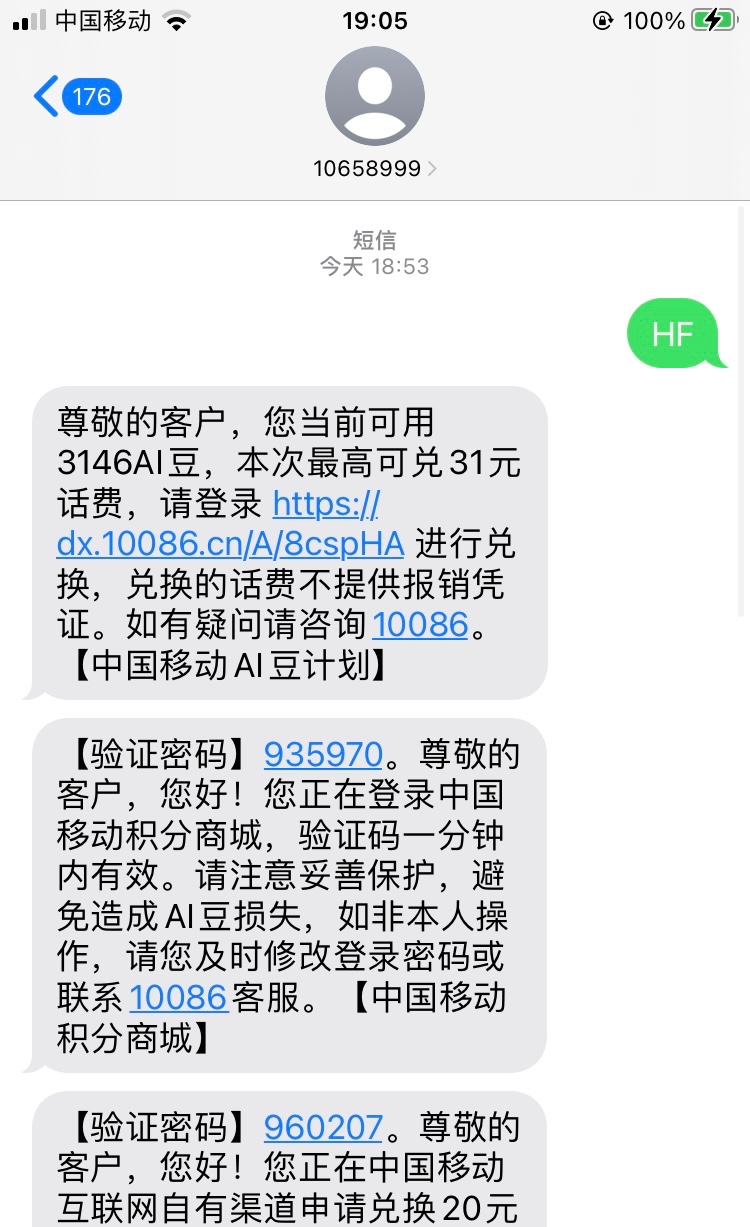 移动发10658999 信息HF 就能知道自己能换多少话费 自己操作就行31号过期了
