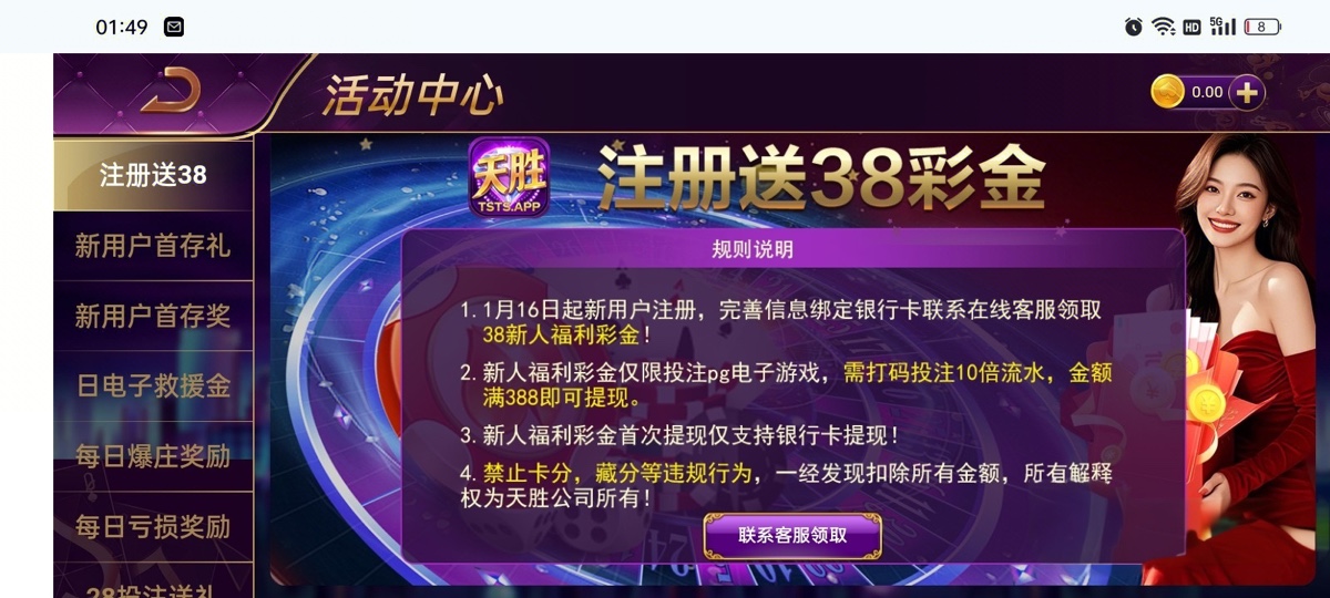 注册下载绑卡,找客服申请领取38。注意事项:不要转换网络不要开加速器不然容易IP异常,最好全程流量操作。出款自测。希望各位兄弟能吃上。网址链接https://tg.ts89.org/tg/?inviteCode