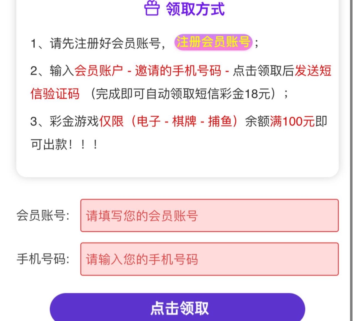 进网站随便输入一个账号 再输入自己手机号 是特邀的话再去注册 特邀碰瓷都去试试 还有下载app彩金 游戏和提款限制自行查看