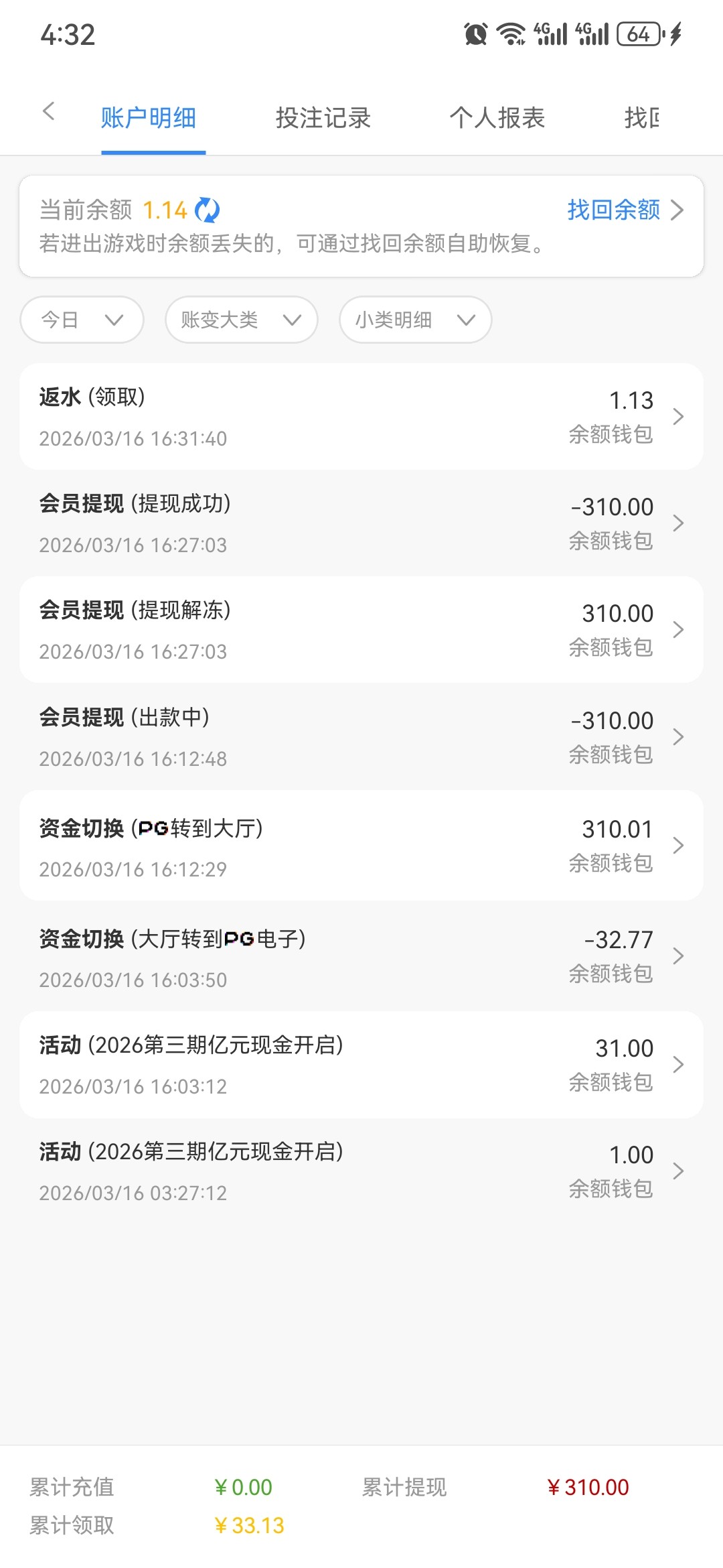 不用打流水,只要够310余额就可以提现