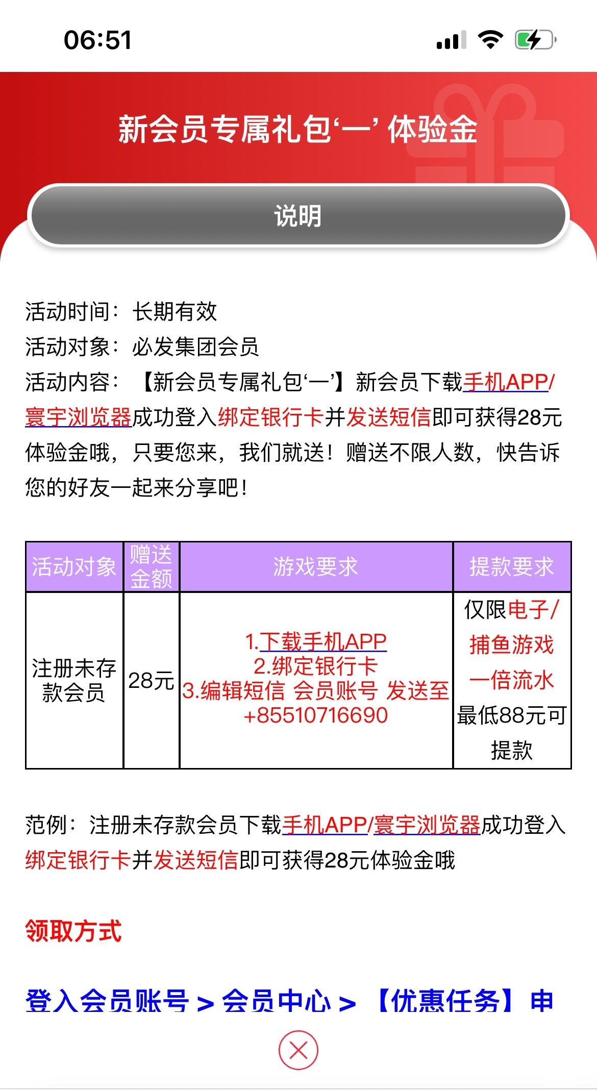 注册绑卡到活动中心找到新用户送28元,按活动发送短信,再到优惠中心申请新用户28元,老用户也可以试一下。