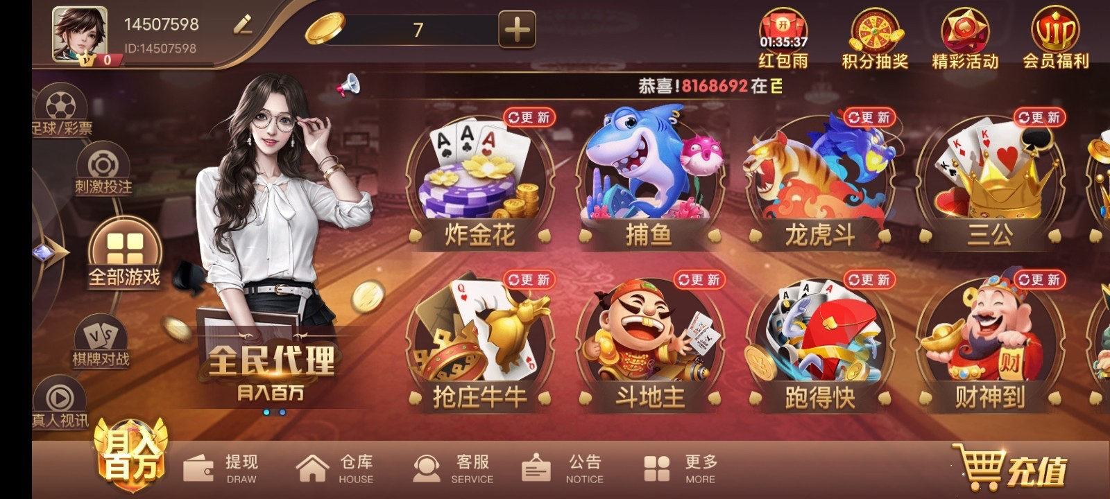 新用户注册绑定手机号码秒7彩金,最低100提,可以0.1捕鱼,到10可玩其他,勿充值白嫖即可