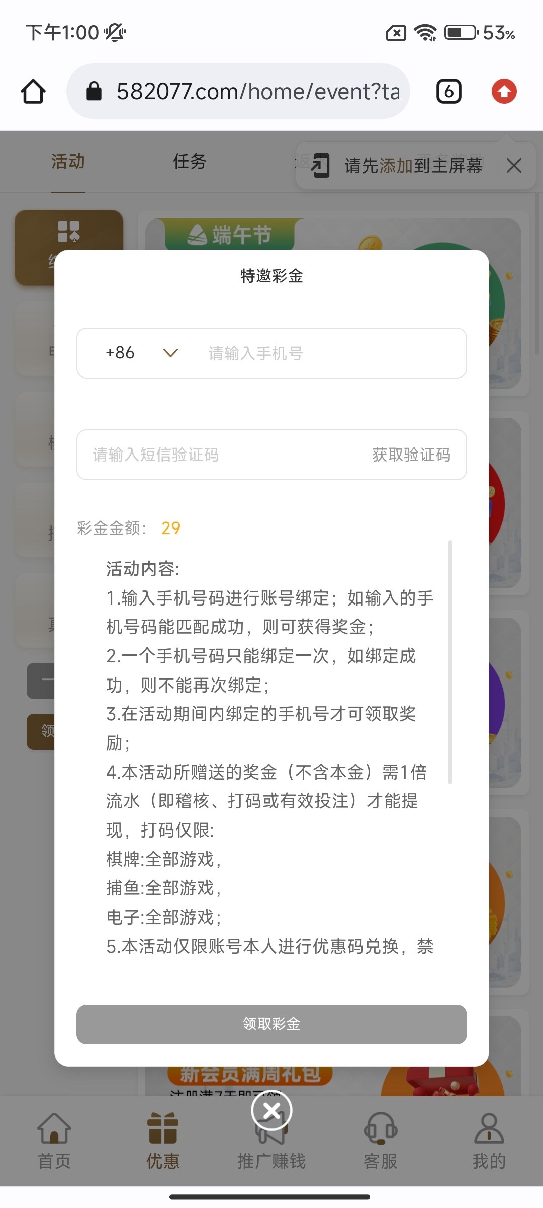新用户注册绑定手机号点开活动大厅,特邀彩金页面输入手机号申请!特邀碰瓷!没碰到后面会发短信过来!